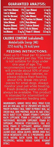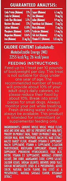 Trigo integral molido, harina de trigo, harina de carne y hueso (fuente de sabor a carne de res), grasa de res (conservada con BHA/BHT), harina de subproductos de aves de corral, harina de subproductos de pavo, sal, harina de pollo, grasa de tocino, fosfato dicálcico, extracto de malta, harina de cebada malteada, vitaminas (suplemento de vitamina E, suplemento de niacina, suplemento de vitamina A, pantotenato de calcio D, suplemento de riboflavina, clorhidrato de piridoxina, suplemento de vitamina D3, ácido fólico, biotina, suplemento de vitamina B12), minerales (sulfato ferroso, óxido de zinc, óxido manganoso, sulfato de cobre, yodato de calcio, selenito de sodio), levadura de cerveza seca, metabisulfito de sodio (usado como conservante), colorante añadido, sabor natural a tocino, BHA (usado como conservante), sabor natural a salchicha, extracto de romero.